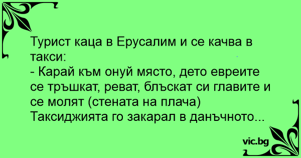 - Карай към онуй място, дето евреите се тръшкат, реват, блъскат си главите и се молят (стената на плача)