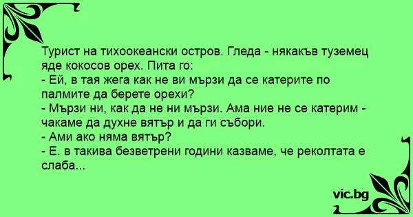 Турист на тихоокеански остров. Гледа - някакъв туземец яде кокосов орех. Пита го: