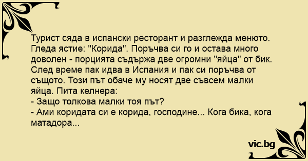 Гледа ястие: "Корида". Поръчва си го и остава много доволен - порцията съдържа две огромни "яйца" от бик.