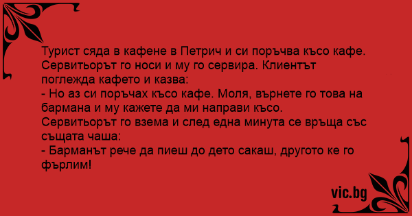 Турист сяда в кафене в Петрич и си поръчва късо кафе. Сервитьорът го носи и му го сервира. Клиентът поглежда кафето и казва: