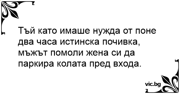 Тъй като имаше нужда от поне два часа истинска почивка, мъжът помоли жена си да паркира колата пред входа.