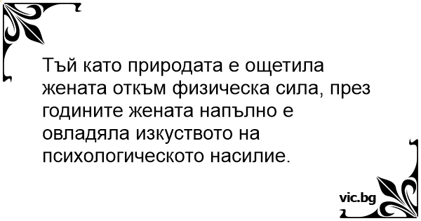 Тъй като природата е ощетила жената откъм физическа сила, през годините жената напълно е овладяла изкуството на психологическото насилие.