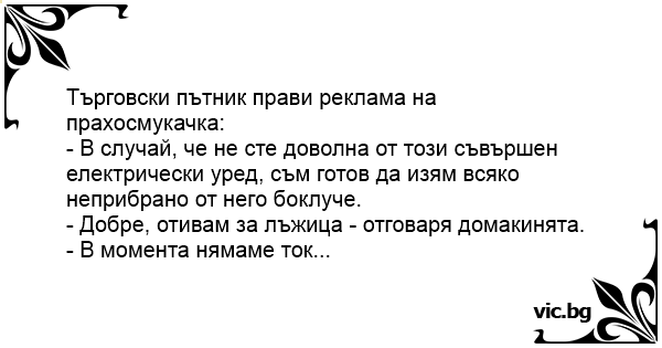Egy porszívóügynök betolakodik egy házba, és a háziasszony minden tiltakozása ellenére nagy rakás száraz lócitromot szór a szoba közepére. A nő felháborodik: - Mit képzel? - Asszonyom, ígérem, amit... K Novákům přijde prodavač vysavačů. Na zem vysype spoustu odpadků a říká: „Všechno, co ten vysavač nevysaje, sním.” „Tak to vám přeji dobrou chuť, od včerejška nám nejde proud.” A little old lady answered her doorbell and saw a well-dressed young man carrying a vacuum cleaner. “Good morning,” said the young man. “If I could take a couple of minutes of your time, I would... Do mieszkania Kowalskiej wtargnął akwizytor sprzedający odkurzacze. Rzucił na dywan śmieci, papierki, resztki jedzenia i mówi: - Zjem każdą rzecz, której nie wciągnie ten rewelacyjny odkurzacz. -... Uma dona de casa, num vilarejo, ao atender as palmas em sua porta... — Ô de casa, tô entrando! Ela se depara com um homem que vai entrando em sua casa e joga esterco de cavalo em seu tapete da... En ung dammsugarförsäljare var ute på säljresa i obygden. Han kom fram till ett gammalt torp, knackade på och blev insläppt av en gammal kvinna. Försäljaren hällde ut en påse med damm på golvet och... Geht ein Staubsaugervertreter auf den Bauernhof. Er schüttet einen Sack Staub aus und sagt: "Alles was mein Staubsauger nicht aufsaugt, esse ich. Daraufhin die Bäuerin: "Ich hole Ihnen einen Löffel, wir haben nämlich gerade keinen Strom." A new vacuum cleaner salesman knocked on the door on the First house of the street. A tall lady answered the door. Пътуващ продавач на прахосмукачки позвънил на вратата на първата къща в новата си територия. Отворила му жена, но преди да успее да каже нещо, той се втурнал вътре и изсипал купчина конска тор на килима. Βιάστηκε... Седи си една жена у дома е на вратата се чука. Llaman a la puerta,y abren Vendedor:la apeteria la nueva aspiradora 3000? Dueño de la casa:mmm,no se... Vendedor:intente aspirar esa ****,si no lo consigue me la como Dueño de la casa:pues espero q... Er komt een vertegenwoordiger in stofzuigers langs bij een boerderij. Hij belt aan, de boerin doet open. De vertegenwoordiger begint te praten: 'Dag mevrouw, ik ben vertegenwoordiger van hele goede... Un promotore di una certa firma va in giro a cercar di vendere il nuovo prodotto... Un aspirapolvere miracoloso. Arriva davanti ad una casa, bussa alla porta e gli apre una vecchietta; il promotore... To get a massive and immediate attention from a buyer, the Vacuum Cleaner salesman opens a bag of horse manure and spreads it all over the carpet. Then he says to the possible buyer with... A little old lady answered a knock on the door to be greeted by a vacuum cleaner salesman. ‘fuck off im busy she said’ closing the door! ‘wait’ he says holding the door open whilst tipping a bucket... Dolazi prodavač usisavača kod babe na vrata, - "Evo imamo nove...." - "Nemam ja novaca za to sinko!" - "Ma molim Vas samo mala demonstracija." Uđe on i iz vreće istrese hrpu smeća babi na tepih. -...