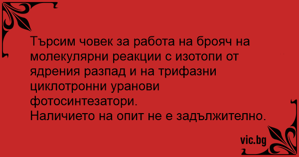 Търсим човек за работа на брояч на молекулярни реакции с изотопи от ядрения разпад и на трифазни циклотронни уранови фотосинтезатори.