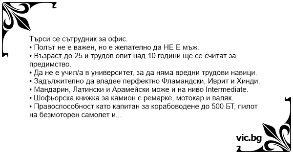 Търси се сътрудник за офис. • Полът не е важен, но е желателно да НЕ Е мъж. • Възраст до 25 и трудов опит над 10 години ще се считат за предимство. • Да не е учил/а в университет, за да няма вредни трудови навици. • Задължително да владее перфектно Фламандски, Иврит и Хинди. • Мандарин, Латински и Арамейски може и на ниво Intermеdiate. • Шофьорска книжка за камион с ремарке, мотокар и валяк. • Правоспособност като капитан за корабоводене до 500 БТ, пилот на безмоторен самолет и малък дракон (виж. „Игра на тронове“, 5-ти сезон). • Ако си носи собствен дракон ще си счита за предимство! • Заплащането е малко, но за сметка на това редовно. т. е. редовно не се плаща. • Предлагат се отлични възможности за кариерно развитие по хоризонтала, а също така възможност за развитие на депресия, параноя и хемороиди.