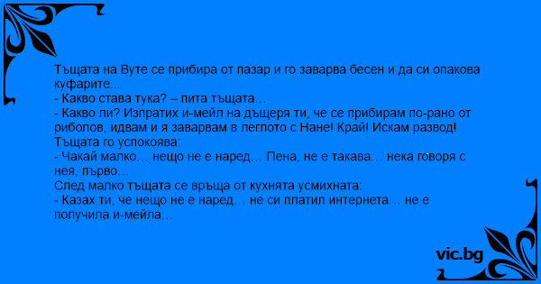 - Какво става тука? – пита тъщата…