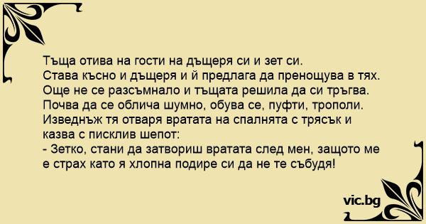 Става късно и дъщеря и й предлага да пренощува в тях. Още не се разсъмнало и тъщата решила да си тръгва. Почва да се облича шумно, обува се, пуфти, трополи. Изведнъж тя отваря вратата на спалнята с трясък и казва с писклив шепот: