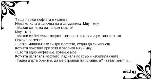 - Махни се бе! Няма кюфте! - казала тъщата и изритала котката.