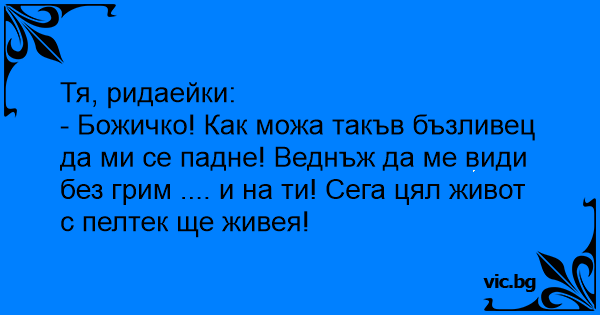 - Божичко! Как можа такъв бъзливец да ми се падне! Веднъж да ме види без грим .... и на ти! Сега цял живот с пелтек ще живея!