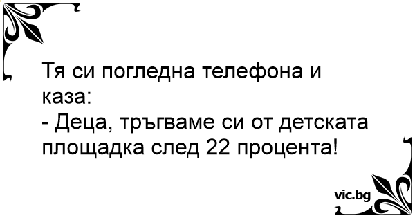 Тя си погледна телефона и каза:<br />- Деца, тръгваме си от детската площадка след 22 процента!