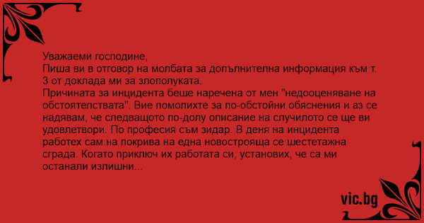 Пиша ви в отговор на молбата за допълнителна информация към т. 3 от доклада ми за злополуката.