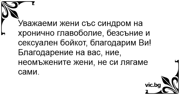 Уважаеми жени със синдром на хронично главоболие, безсъние и cekcуaлeн бойкот, благодарим Ви!