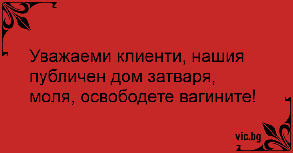 Уважаеми клиенти, нашия публичен дом затваря, моля, освободете вагините!
