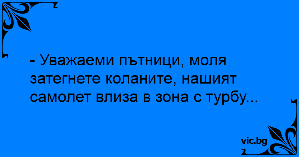 - Уважаеми пътници, моля затегнете коланите, нашият самолет влиза в зона с турбу...