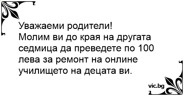 Молим ви до края на другата седмица да преведете по 100 лева за ремонт на онлине училището на децата ви.