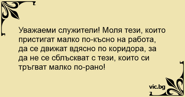 Уважаеми служители! Моля тези, които пристигат малко по-късно на работа, да се движат вдясно по коридора, за да не се сблъскват с тези, които си тръгват малко по-рано!