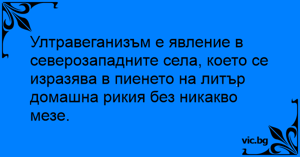 Ултравеганизъм е явление в северозападните села, което се изразява в пиенето на литър домашна рикия без никакво мезе.