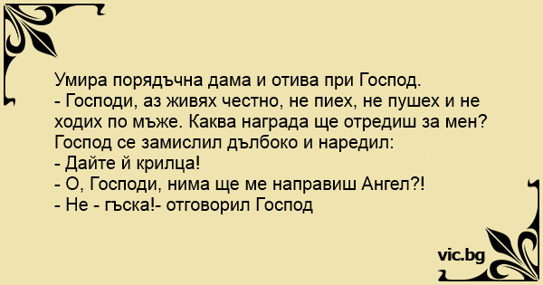 - Господи, аз живях честно, не пиех, не пушех и не ходих по мъже. Каква награда ще отредиш за мен?