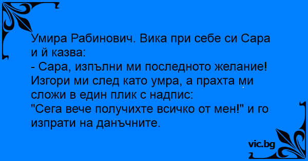 - Сара, изпълни ми последното желание! Изгори ми след като умра, а прахта ми сложи в един плик с надпис: