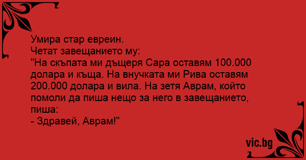 "На скъпата ми дъщеря Сара оставям 100.000 долара и къща. На внучката ми Рива оставям 200.000 долара и вила. На зетя Аврам, който помоли да пиша нещо за него в завещанието, пиша: