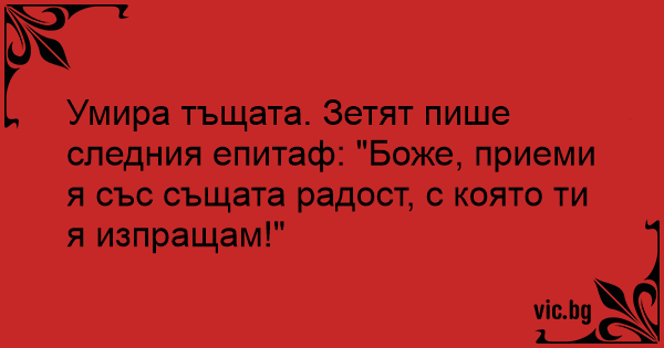 Умира тъщата. Зетят пише следния епитаф: "Боже, приеми я със същата радост, с която ти я изпращам!"