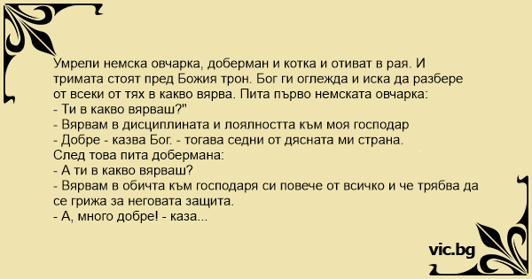 Умрели немска овчарка, доберман и котка и отиват в рая. И тримата стоят пред Божия трон. Бог ги оглежда и иска да разбере от всеки от тях в какво вярва. Пита първо немската овчарка: