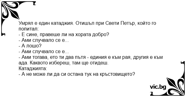Умрял е един катаджия. Отишъл при Свети Петър, който го попитал: