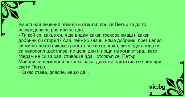 - Ти кой си, какъв си, я да видим какви грехове имаш и какви добрини си сторил? Ааа, геймър значи, няма добрини, през целия си живот почти никаква работа не си свършил, нито една жена не си направил щастлива, по цели дни и нощи на компютъра...като гледам не си за рая, отиваш в ада - отсякъл св. Петър.