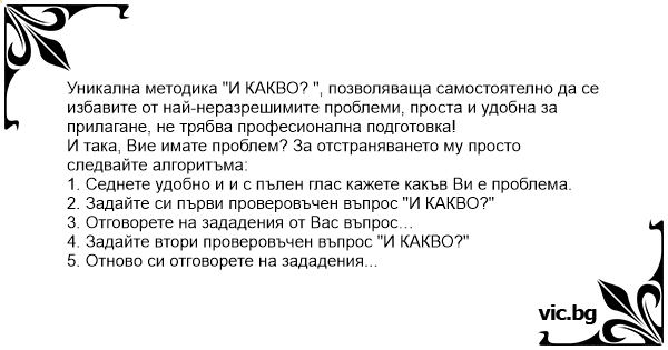 Следвайте алгоритъма, повтаряйки проверовъчния въпрос "И КАКВО?" до тогава, докато в качеството на отговор не чуете да произнасяте "АМИ НИЩО!"