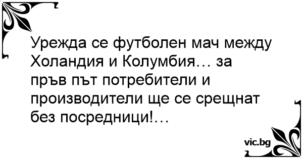 Урежда се футболен мач между Холандия и Колумбия… за пръв път потребители и производители ще се срещнат без посредници!…