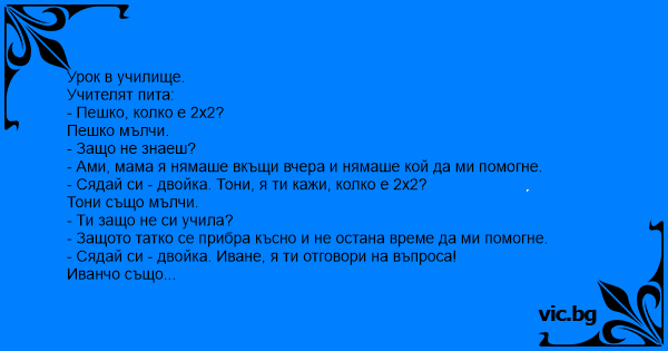 - Сядай си - двойка. Тони, я ти кажи, колко е 2х2?