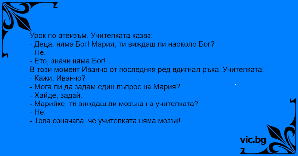 Урок по атеизъм. Учителката казва: