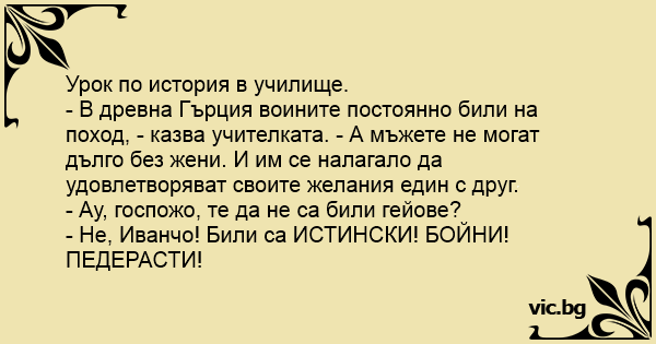 - В древна Гърция воините постоянно били на поход, - казва учителката. - А мъжете не могат дълго без жени. И им се налагало да удовлетворяват своите желания един с друг.