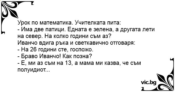 - Има две патици. Едната е зелена, а другата лети на север. На колко години съм аз?