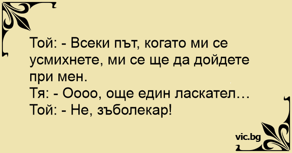 "Frau Schneider, wenn Sie mich so anlachen, wünschte ich mir, dass Sie mich besuchen kommen.",- "Sie Schmeichler, Sie.",- "Nun ja, wie man es nimmt - ich bin Zahnarzt." Mężczyzna do kobiety: - Gdy widzę pani uśmiech, mam nadzieję, że złoży mi pani wizytę. - Podrywacz z pana! - Nie, dentysta. Hij: "Mevrouw, als u zo naar mij lacht, dan weet ik dat ik u binnenkort weer zie!" Zij: "Nou, u bent nog al overtuigd van uzelf!" Hij: "Nee, ik ben tandarts!" A boy met a girl.... Girl: Every time you smile, I feel like inviting you to my place. Boy (smiling): Why thank you... are you single? Girl: No, I am a dentist. "Frøken Hansen, sikke et smil De har! Skal vi ikke lave en aftale med det samme?" "Ih, De er vel nok en charmetrold." "Nej, jeg er tandlæge..." Un mec, une nana : – À chaque fois que tu souris, j’ai envie de te ramener chez moi. – Ah ! Tu es célibataire ? – Non, dentiste… - Når jeg ser på Deres smil, frøken, er jeg sikker på, vi snart får en aftale. - De er vist en værre scoretrold. - Næh, jeg er tandlæge. I was on a train and this woman opposite looked at me and said "Every time you smile, I feel like inviting you to my place..." I asked "Are you single?" She replied "No, I'm a dentist." A guy is talking to a girl A guy is talking to a girl : "Everytime I see your smile, I want to take you to my place" "Oh ! You think I'm pretty ?" "No, I'm a dentist." - Valahányszor meglátom önt mosolyogni, asszonyom, mindig arra gondolok, hogy fel kellene csábítanom a lakásomra. - Nocsak, nocsak! Ekkora nagy nőcsábász? - Nem asszonyom, fogorvos vagyok. — Дівчино, коли я бачу вашу посмішку, мені хочеться запросити вас до себе. — Ви нахаба! — Ні, я стоматолог. - Liisa, nähdessäni hymysi aavistan, että tapaamme vielä uudelleen. - Oletko selvännäkijä? - En, vaan hammaslääkäri.