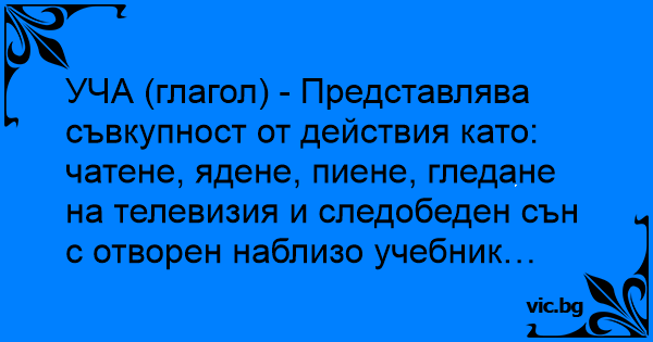 УЧА (глагол) - Представлява съвкупност от действия като: чатене, ядене, пиене, гледане на телевизия и следобеден сън с отворен наблизо учебник…