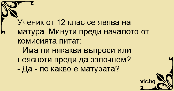 Ученик от 12 клас се явява на матура. Минути преди началото от комисията питат: