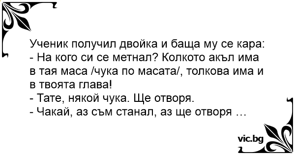 - Сине, тъп си като ей тая маса! - и чука по масата.