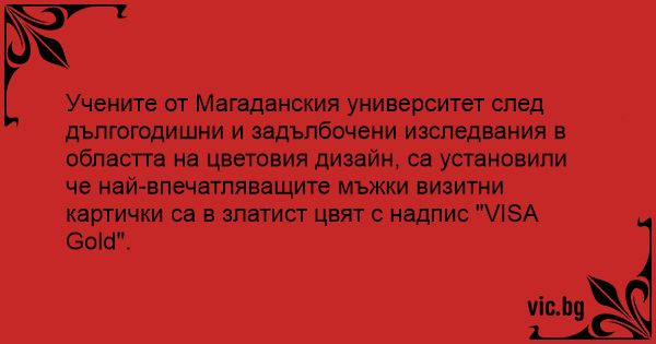 Учените от Магаданския университет след дългогодишни и задълбочени изследвания в областта на цветовия дизайн, са установили че най-впечатляващите мъжки визитни картички са в златист цвят с надпис "VISA Gold".