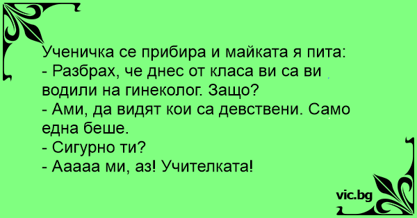 Žákyně deváté třídy přijde domů ze školy a povídá mamince: „Dnes jsme byly na gynekologické prohlídce.” „No a?” „V celé třídě je už jen jedna panna!” „Doufám, že jsi to ty!” „Ne, paní učitelka!”