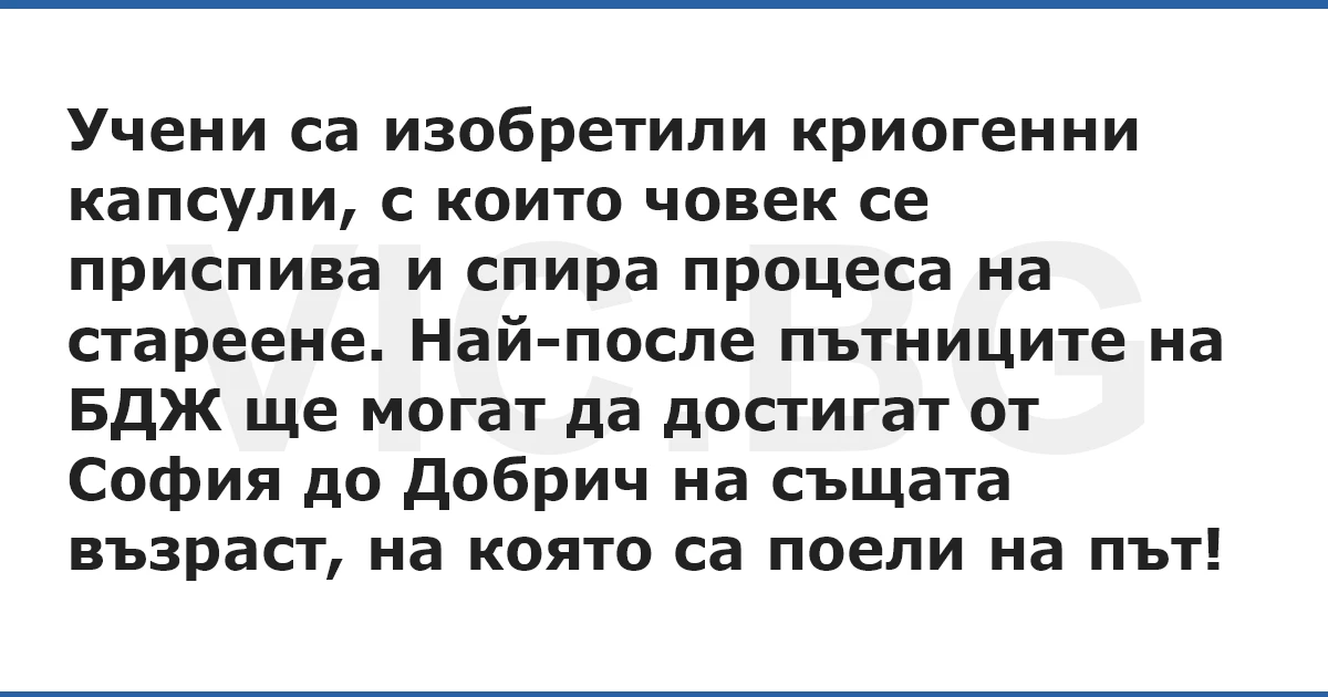 Учени са изобретили криогенни капсули, с които човек се приспива и спира процеса на стареене. Най-после пътниците на БДЖ ще могат да достигат от София до Добрич на същата възраст, на която са поели на път!
