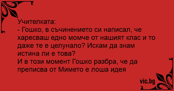 - Гошко, в съчинението си написал, че харесваш едно момче от нашият клас и то даже те е целунало? Искам да знам истина ли е това?