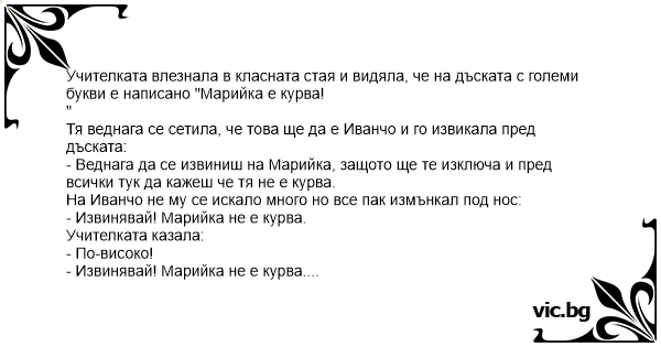 - Веднага да се извиниш на Марийка, защото ще те изключа и пред всички тук да кажеш че тя не е kуpba.