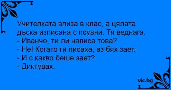 Учителката влиза в клас, а цялата дъска изписана с псувни. Тя веднага: