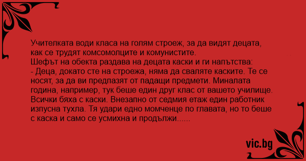 - Деца, докато сте на строежа, няма да сваляте каските. Те се носят, за да ви предпазят от падащи предмети. Миналата година, например, тук беше един друг клас от вашето училище. Всички бяха с каски. Внезапно от седмия етаж един работник изпусна тухла. Тя удари едно момченце по главата, но то беше с каска и само се усмихна и продължи...