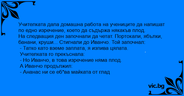 На следващия ден започнали да четат. Портокали, ябълки, банани, круши... Стигнали до Иванчо. Той започнал: