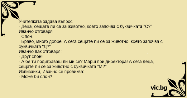 - А бе ти подиграваш ли ми се? Марш при директора! А сега деца, сещате ли се за животно с буквичката "М?"