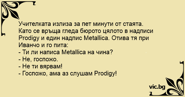 Като се връща гледа бюрото цялото в надписи Prodigy и един надпис Metallica. Отива тя при Иванчо и го пита: