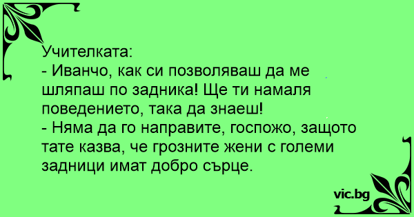 - Иванчо, как си позволяваш да ме шляпаш по задника! Ще ти намаля поведението, така да знаеш!