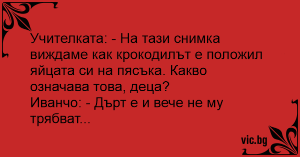 Учителката: - На тази снимка виждаме как крокодилът е положил яйцата си на пясъка. Какво означава това, деца?